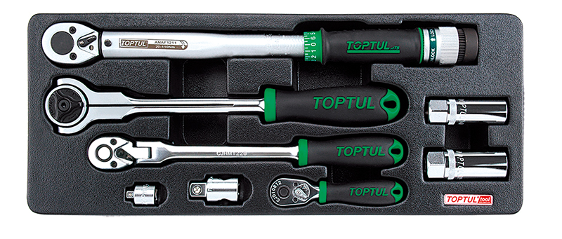 Набор трещоток 1/4", 3/8", 1/2", динамометрический ключ 3/8" 20-110 Нм, переходники и свечные головки, 8 предметов в ложементе (B) TOPTUL купить в Вологде и других городах России