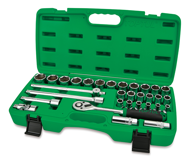 Набор головок и аксессуаров 1/2" 6-гранных 8-32 мм, 31 предмет TOPTUL